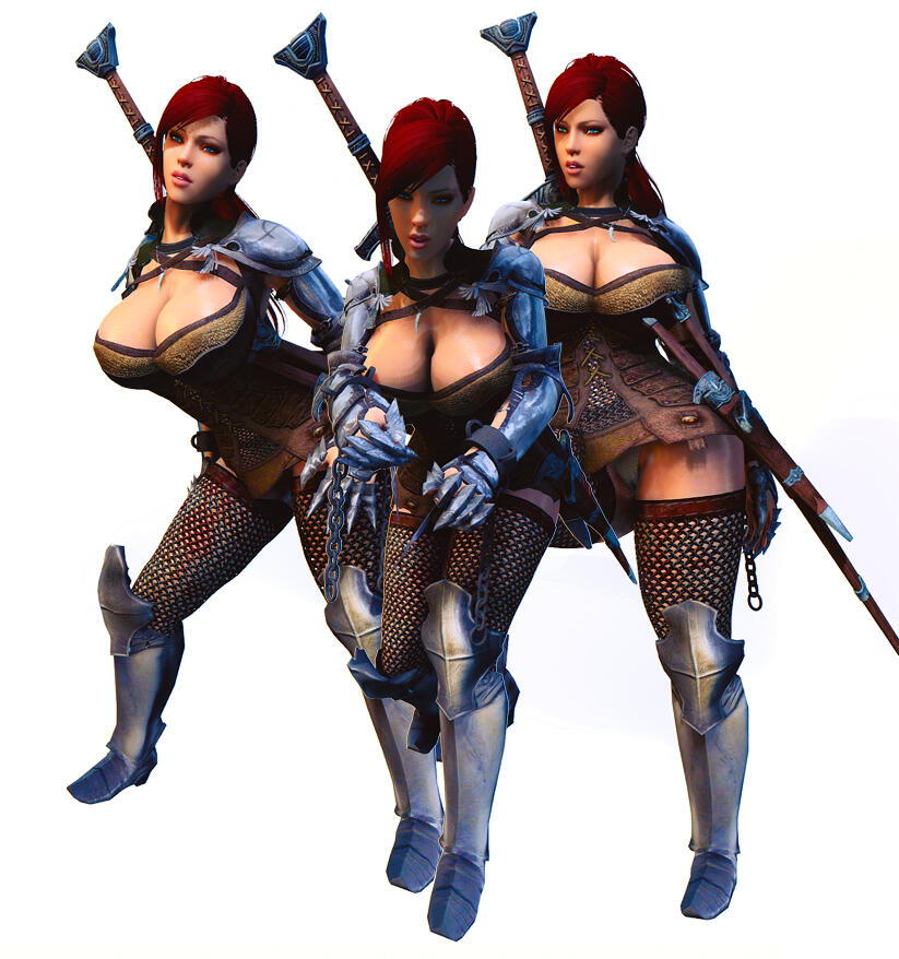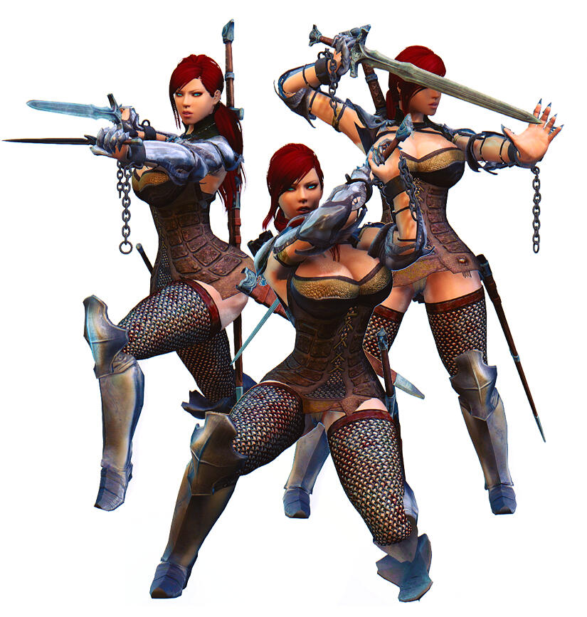 Primarily she relies on a greatsword for upfront confrotation, but often uses it for a quick dispatch, then relying on a standard broadsword and a variety of knives to eliminate her enemies.